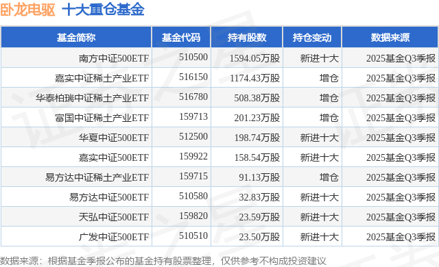 根据2025基金Q3季报公募基金重仓股数据,重仓该股的公募基金共37家,其中持有数量最多的公募基金为南方基金的南方中证500ETF。南方中证500ETF目前规模为400.98亿元,最新净值7.5543(12月29日),较上一交易日下跌0.39%,近一年上涨28.12%。该公募基金现任基金经理为罗文杰。罗文杰在任的基金产品包括:南方中证500ETF联接(LOF)A,管理时间为2013年4月22日至今,期间收益率为149.35%;南方沪深300ETF,管理时间为2013年5月17日至今,期间收益率为153.79%;南方沪深300ETF联接A,管理时间为2013年5月17日至今,期间收益率为139.15%。