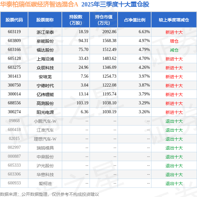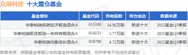 根据2025基金Q3季报公募基金重仓股数据,重仓该股的公募基金共3家,其中持有数量最多的公募基金为华泰柏瑞基金的华泰柏瑞低碳经济智选混合A。华泰柏瑞低碳经济智选混合A目前规模为2.49亿元,最新净值0.6103(12月29日),较上一交易日上涨0.99%,近一年上涨34.72%。该公募基金现任基金经理为赵楠。赵楠在任的基金产品包括:华泰柏瑞均衡成长混合A,管理时间为2023年8月22日至今,期间收益率为12.28%;华泰柏瑞聚优智选一年持有期混合A,管理时间为2024年8月2日至今,期间收益率为26.0%;