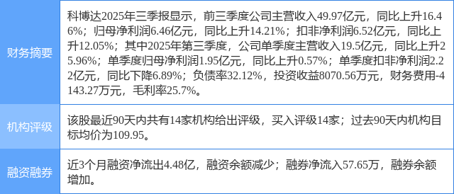 2025年10月28日,民生证券研究员崔琰,白如发布了对科博达的研报《系列点评六:2025Q3业绩符合预期 新产品、新客户持续突破》,该研报对科博达给出“买入”评级。研报中预计2025-2027年营收为74.7/98.6/122.0亿元,归母净利为9.0/12.5/16.6亿元,EPS为2.23/3.10/4.12元,对应2025年10月28日79.8元/股收盘价,PE为36/26/19倍,维持“推荐”评级。证券之星数据中心根据近三年发布的研报数据计算,该研报作者对此股的盈利预测准确度为88.47%。