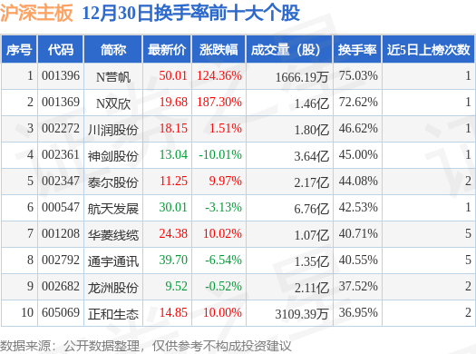 当日沪深主板换手率前10大个股中6只个股收涨,平均涨幅57.19%,其中N誉帆(001396)以换手率75.03%排第一,5只个股近5个交易日中多次上榜。