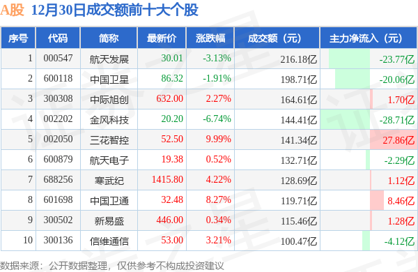 当日A股成交额前10大个股中7只个股收涨,平均涨幅4.12%,其中航天发展(000547)以成交额216.18亿元排第一。从主力资金流入看,成交额前10大个股中有5只个股呈现主力资金净流入。
