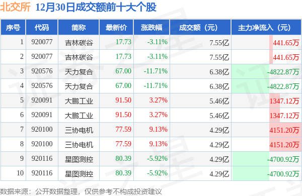 当日北交所成交额前10大个股中4只个股收涨,平均涨幅6.2%,其中吉林碳谷(920077)以成交额7.55亿元排第一。从主力资金流入看,成交额前10大个股中有6只个股呈现主力资金净流入。
