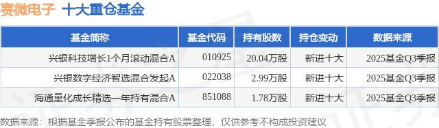 根据2025基金Q3季报公募基金重仓股数据,重仓该股的公募基金共3家,其中持有数量最多的公募基金为兴银基金管理的兴银科技增长1个月滚动混合A。兴银科技增长1个月滚动混合A目前规模为0.95亿元,最新净值1.1926(12月29日),较上一交易日上涨0.51%,近一年上涨26.95%。该公募基金现任基金经理为张世略。张世略在任的基金产品包括:兴银策略智选混合A,管理时间为2020年11月10日至今,期间收益率为17.03%;兴银数字经济智选混合发起A,管理时间为2024年9月5日至今,期间收益率为39.88%。
