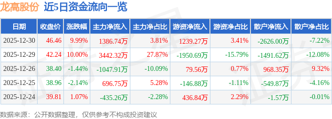 证券之星消息,截至2025年12月30日收盘,龙高股份(605086)报收于46.46元,上涨9.99%,已连续涨停2天,换手率4.51%,成交量8.08万手,成交额3.64亿元。