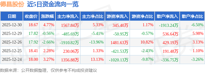 证券之星消息,截至2025年12月30日收盘,德昌股份(605555)报收于18.67元,上涨4.77%,换手率3.3%,成交量15.96万手,成交额2.94亿元。