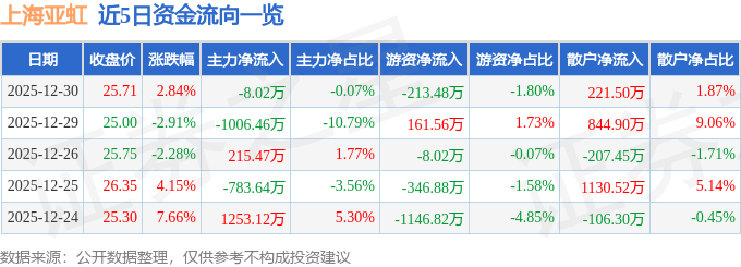 证券之星消息,截至2025年12月30日收盘,上海亚虹(603159)报收于25.71元,上涨2.84%,换手率3.28%,成交量4.6万手,成交额1.19亿元。