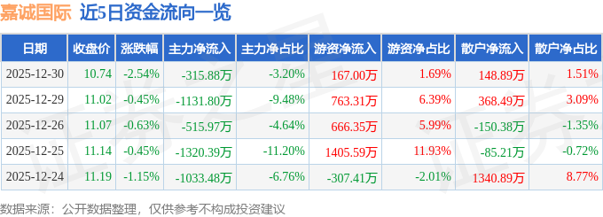 证券之星消息,截至2025年12月30日收盘,嘉诚国际(603535)报收于10.74元,下跌2.54%,换手率1.79%,成交量9.15万手,成交额9868.06万元。