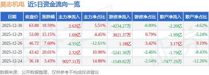 证券之星消息,截至2025年12月30日收盘,昊志机电(300503)报收于63.8元,上涨18.59%,换手率33.8%,成交量81.45万手,成交额47.6亿元。