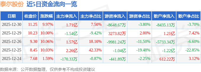 证券之星消息,截至2025年12月30日收盘,泰尔股份(002347)报收于11.25元,上涨9.97%,已连续涨停4天,换手率44.08%,成交量217.47万手,成交额22.79亿元。