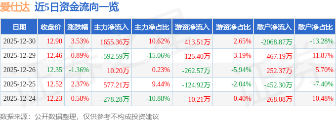 12月30日的资金流向数据方面,主力资金净流入1655.36万元,占总成交额10.62%,游资资金净流入413.51万元,占总成交额2.65%,散户资金净流出2068.87万元,占总成交额13.28%。