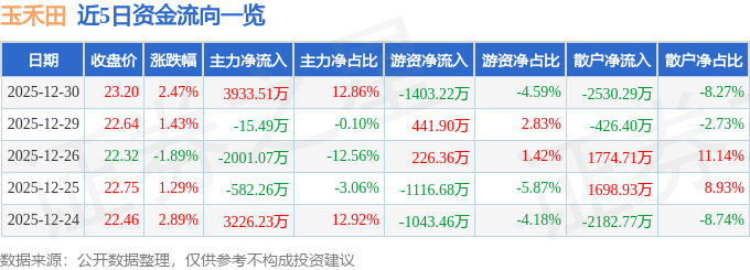 证券之星消息,截至2025年12月30日收盘,玉禾田(300815)报收于23.2元,上涨2.47%,换手率3.39%,成交量13.24万手,成交额3.06亿元。
