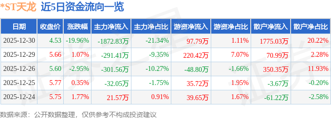 证券之星消息,截至2025年12月30日收盘,*ST天龙(300029)报收于4.53元,下跌19.96%,换手率8.85%,成交量17.73万手,成交额8777.02万元。