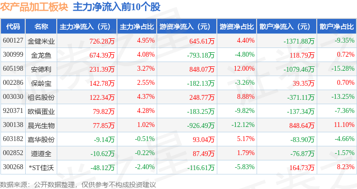从资金流向上来看,当日农产品加工板块主力资金净流出1.34亿元,游资资金净流入6275.32万元,散户资金净流入7113.19万元。农产品加工板块个股资金流向见下表: