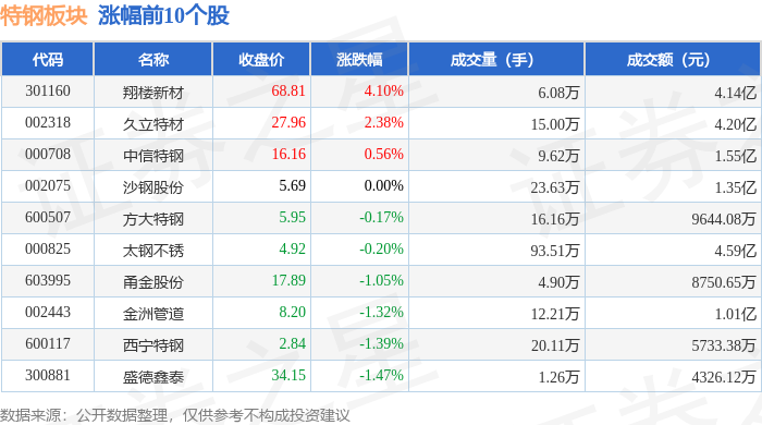 证券之星消息,12月30日特钢板块较上一交易日上涨0.24%,翔楼新材领涨。当日上证指数报收于3965.12,下跌0.0%。深证成指报收于13604.07,上涨0.49%。特钢板块个股涨跌见下表: