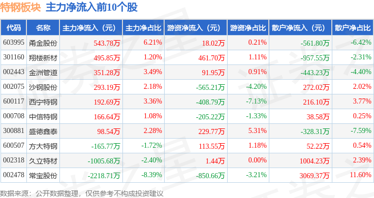 从资金流向上来看,当日特钢板块主力资金净流出9969.27万元,游资资金净流出1213.46万元,散户资金净流入1.12亿元。特钢板块个股资金流向见下表: