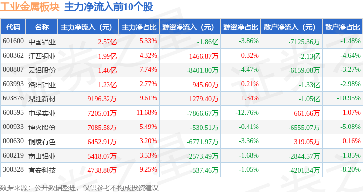 从资金流向上来看,当日工业金属板块主力资金净流出4.75亿元,游资资金净流出4.94亿元,散户资金净流入9.69亿元。工业金属板块个股资金流向见下表: