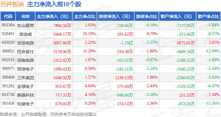 从资金流向上来看,当日元件板块主力资金净流出31.69亿元,游资资金净流入8.24亿元,散户资金净流入23.45亿元。元件板块个股资金流向见下表: