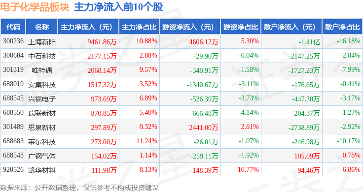 从资金流向上来看,当日电子化学品板块主力资金净流出10.07亿元,游资资金净流入1.7亿元,散户资金净流入8.37亿元。电子化学品板块个股资金流向见下表:
