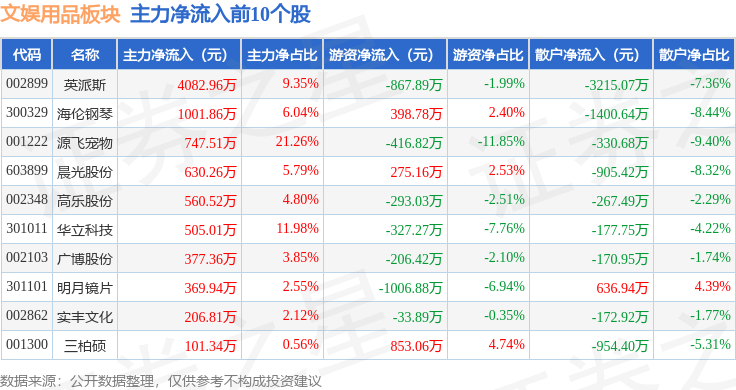 从资金流向上来看,当日文娱用品板块主力资金净流入1826.39万元,游资资金净流出1078.66万元,散户资金净流出747.73万元。文娱用品板块个股资金流向见下表: