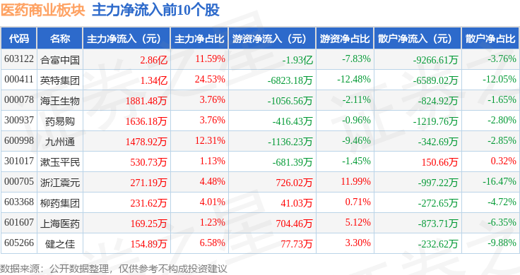 从资金流向上来看,当日医药商业板块主力资金净流入2.58亿元,游资资金净流出3.12亿元,散户资金净流入5460.94万元。医药商业板块个股资金流向见下表: