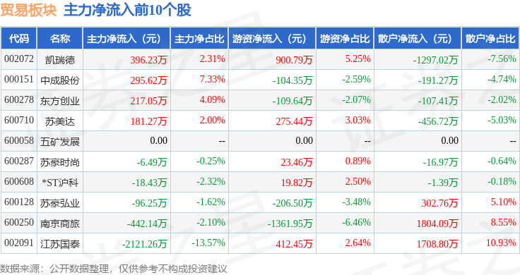 从资金流向上来看,当日贸易板块主力资金净流出8393.7万元,游资资金净流入260.93万元,散户资金净流入8132.77万元。贸易板块个股资金流向见下表: