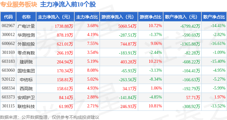 从资金流向上来看,当日专业服务板块主力资金净流出2.09亿元,游资资金净流入9476.75万元,散户资金净流入1.14亿元。专业服务板块个股资金流向见下表:
