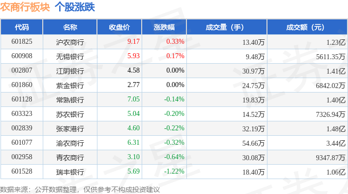 证券之星消息,12月30日农商行板块较上一交易日下跌0.07%,瑞丰银行领跌。当日上证指数报收于3965.12,下跌0.0%。深证成指报收于13604.07,上涨0.49%。农商行板块个股涨跌见下表: