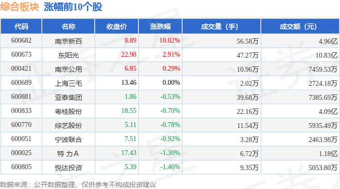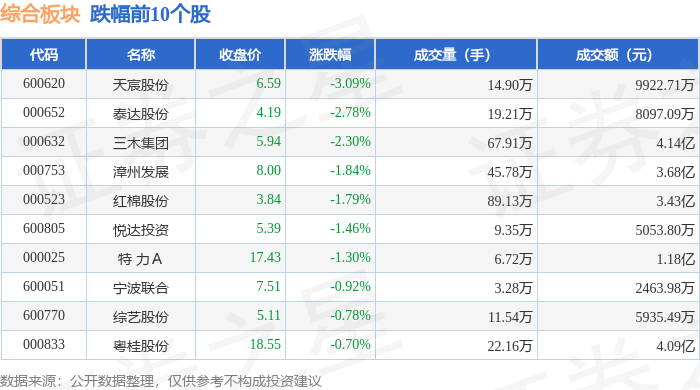从资金流向上来看,当日综合板块主力资金净流入4608.4万元,游资资金净流出8850.54万元,散户资金净流入4242.14万元。综合板块个股资金流向见下表: