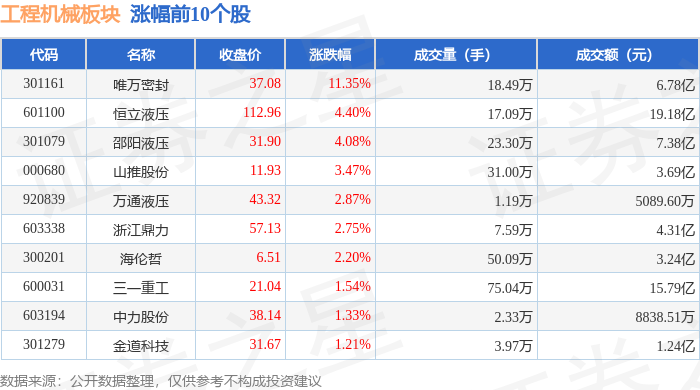 证券之星消息,12月30日工程机械板块较上一交易日上涨1.69%,唯万密封领涨。当日上证指数报收于3965.12,下跌0.0%。深证成指报收于13604.07,上涨0.49%。工程机械板块个股涨跌见下表: