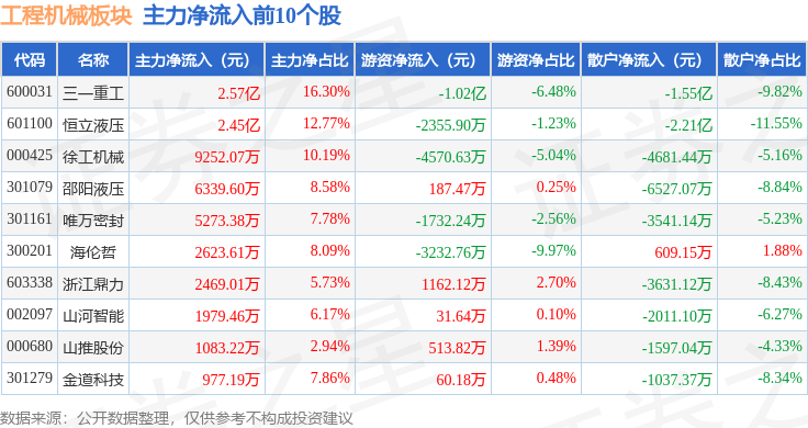 从资金流向上来看,当日工程机械板块主力资金净流入6.1亿元,游资资金净流出2.06亿元,散户资金净流出4.04亿元。工程机械板块个股资金流向见下表: