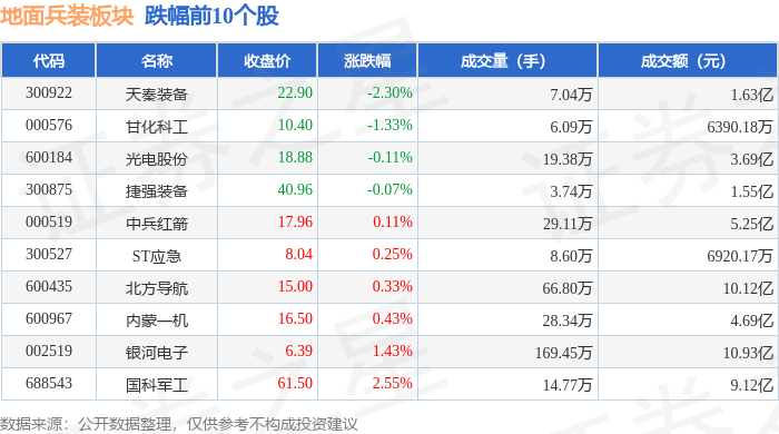 从资金流向上来看,当日地面兵装板块主力资金净流入1.19亿元,游资资金净流入784.12万元,散户资金净流出1.27亿元。地面兵装板块个股资金流向见下表: