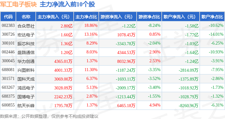 从资金流向上来看,当日军工电子板块主力资金净流出37.74亿元,游资资金净流入10.2亿元,散户资金净流入27.53亿元。军工电子板块个股资金流向见下表: