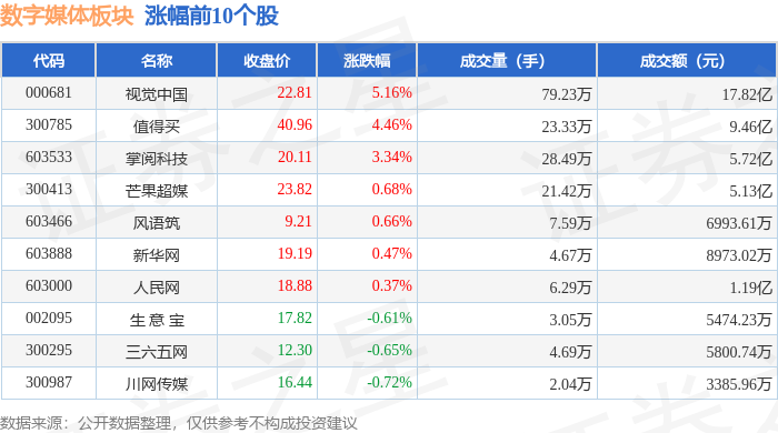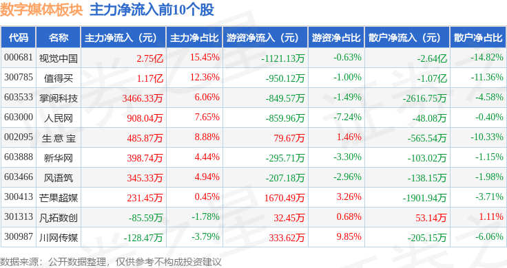 从资金流向上来看,当日数字媒体板块主力资金净流入4.27亿元,游资资金净流出1258.31万元,散户资金净流出4.14亿元。数字媒体板块个股资金流向见下表: