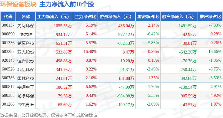 从资金流向上来看,当日环保设备板块主力资金净流出1.3亿元,游资资金净流入1853.3万元,散户资金净流入1.12亿元。环保设备板块个股资金流向见下表: