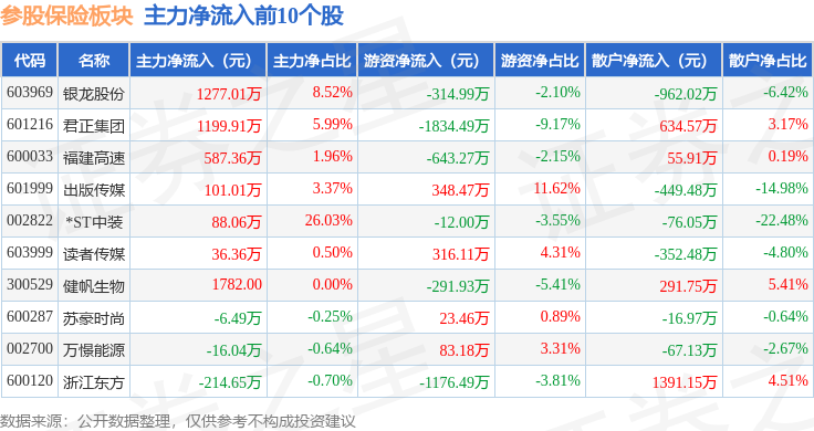 从资金流向上来看,当日参股保险板块主力资金净流出7.59亿元,游资资金净流入2.43亿元,散户资金净流入5.16亿元。参股保险板块个股资金流向见下表:
