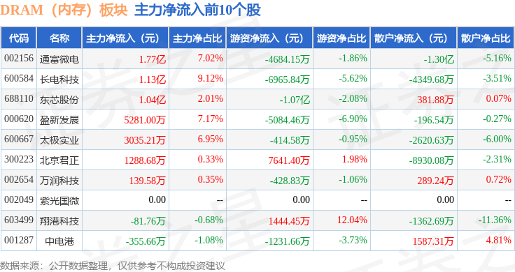 从资金流向上来看,当日DRAM(内存)板块主力资金净流出16.89亿元,游资资金净流入2452.61万元,散户资金净流入16.65亿元。DRAM(内存)板块个股资金流向见下表: