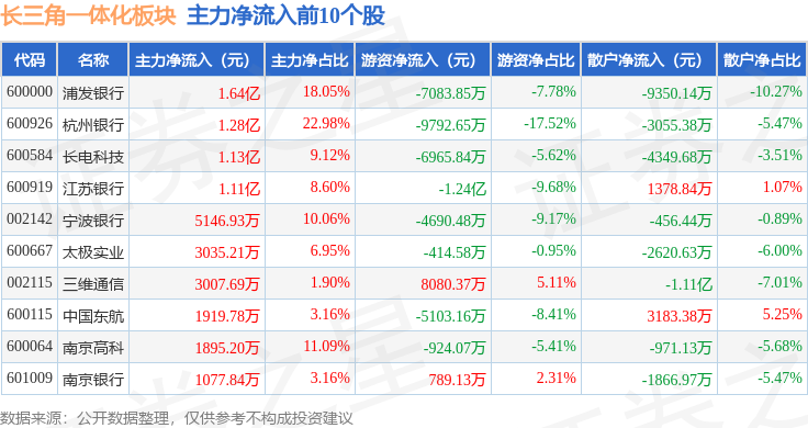 从资金流向上来看,当日长三角一体化板块主力资金净流出15.58亿元,游资资金净流入1.21亿元,散户资金净流入14.37亿元。长三角一体化板块个股资金流向见下表: