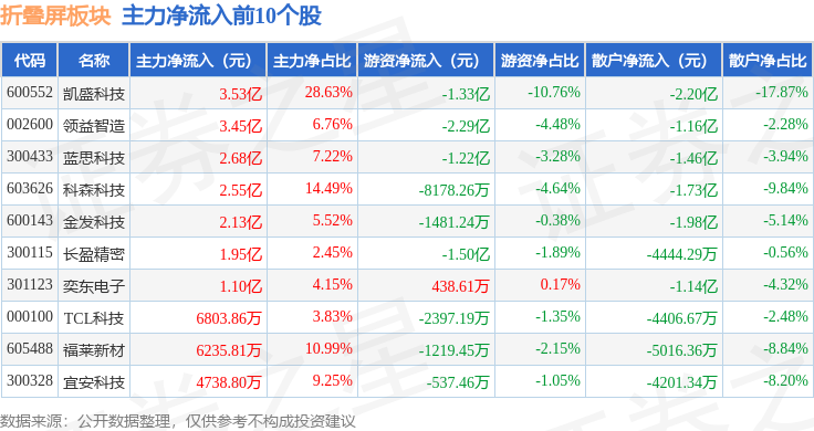 从资金流向上来看,当日折叠屏板块主力资金净流入565.38万元,游资资金净流出7.65亿元,散户资金净流入7.6亿元。折叠屏板块个股资金流向见下表: