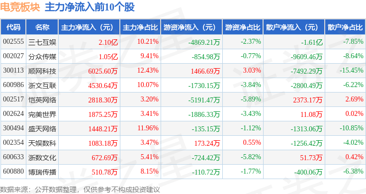 从资金流向上来看,当日电竞板块主力资金净流入9531.85万元,游资资金净流出9732.5万元,散户资金净流入200.65万元。电竞板块个股资金流向见下表: