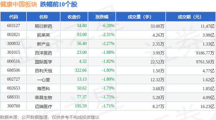 证券之星消息,12月30日健康中国板块较上一交易日下跌0.51%,昭衍新药领跌。当日上证指数报收于3965.12,下跌0.0%。深证成指报收于13604.07,上涨0.49%。健康中国板块个股涨跌见下表: