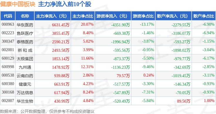 从资金流向上来看,当日健康中国板块主力资金净流出15.88亿元,游资资金净流入1.9亿元,散户资金净流入13.99亿元。健康中国板块个股资金流向见下表: