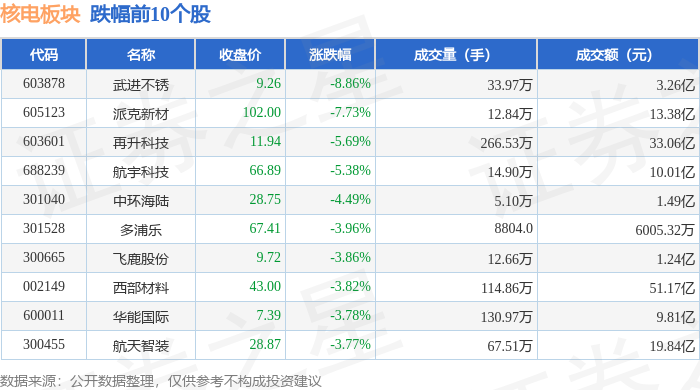证券之星消息,12月30日核电板块较上一交易日下跌0.47%,武进不锈领跌。当日上证指数报收于3965.12,下跌0.0%。深证成指报收于13604.07,上涨0.49%。核电板块个股涨跌见下表: