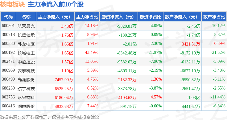 从资金流向上来看,当日核电板块主力资金净流出20.53亿元,游资资金净流出3.54亿元,散户资金净流入24.06亿元。核电板块个股资金流向见下表: