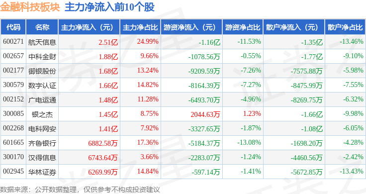 从资金流向上来看,当日金融科技板块主力资金净流出20.12亿元,游资资金净流入6.04亿元,散户资金净流入14.08亿元。金融科技板块个股资金流向见下表:
