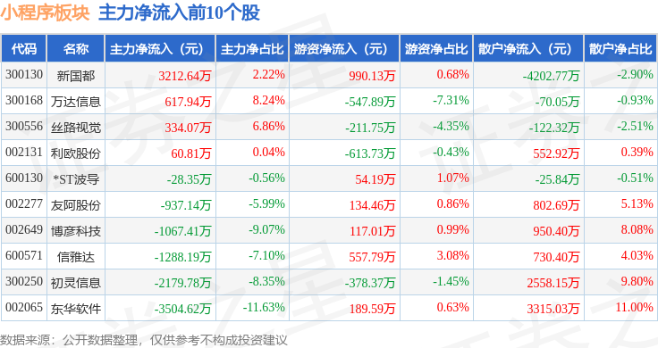 从资金流向上来看,当日小程序板块主力资金净流出3.85亿元,游资资金净流入1.15亿元,散户资金净流入2.7亿元。小程序板块个股资金流向见下表: