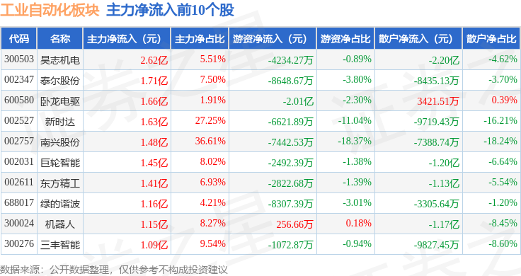 从资金流向上来看,当日工业自动化板块主力资金净流出8.33亿元,游资资金净流入3.01亿元,散户资金净流入5.32亿元。工业自动化板块个股资金流向见下表:
