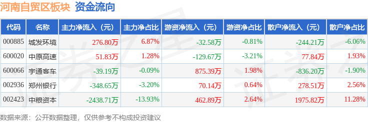 从资金流向上来看,当日河南自贸区板块主力资金净流出2497.91万元,游资资金净流入1246.17万元,散户资金净流入1251.75万元。河南自贸区板块个股资金流向见下表: