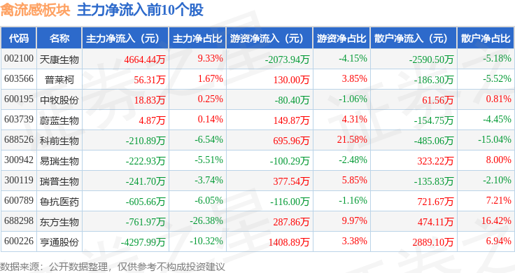 从资金流向上来看,当日禽流感板块主力资金净流出1.04亿元,游资资金净流入3869.35万元,散户资金净流入6535.33万元。禽流感板块个股资金流向见下表: