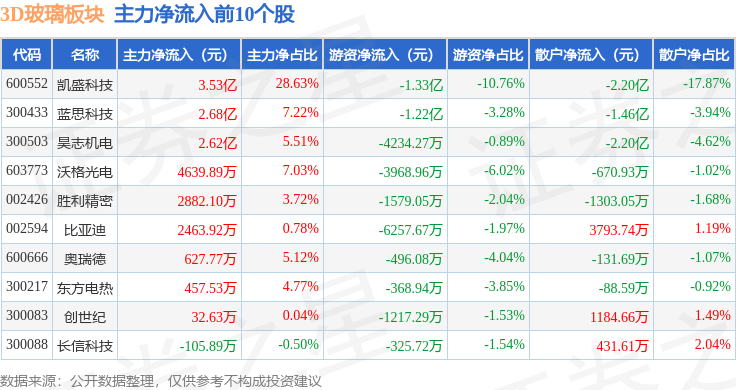 从资金流向上来看,当日3D玻璃板块主力资金净流入5.63亿元,游资资金净流出4.01亿元,散户资金净流出1.62亿元。3D玻璃板块个股资金流向见下表: