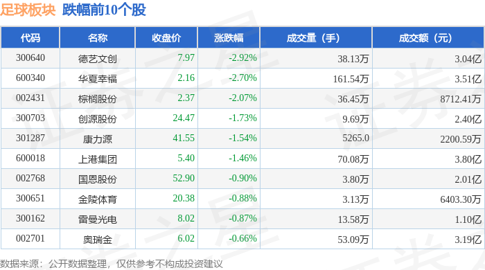 证券之星消息,12月30日足球板块较上一交易日下跌0.13%,德艺文创领跌。当日上证指数报收于3965.12,下跌0.0%。深证成指报收于13604.07,上涨0.49%。足球板块个股涨跌见下表: